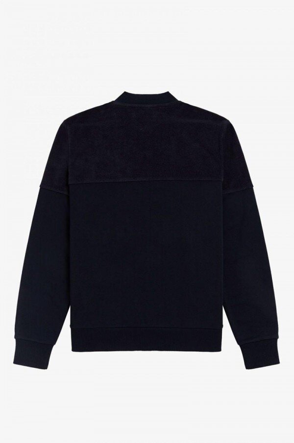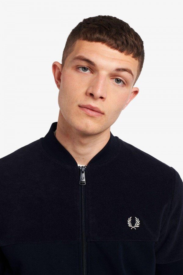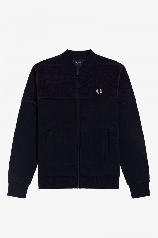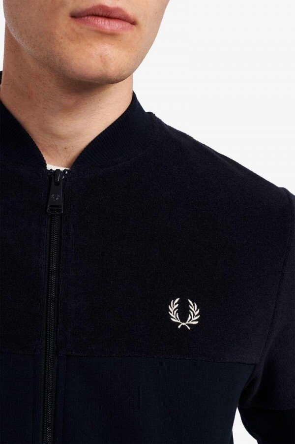 Cotton blend / Regular fit / Towelling top panel and sleeves / Cotton loopback bottom body panel / Flat knit bomber collar and cuffs